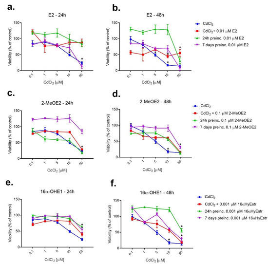 Changes in SKOV-3 viability after 24 h and 7 days of pre-incubation with E2 (a,b), 2-MeOE2 (c,d) and 16-OHE1 (e,f), and exposure to CdCl2 measured by MTT after 24 h and 48 h. The figure also shows the combined action of the interaction of the respective estrogen with CdCl2 (* statistically significant, p < 0.05).