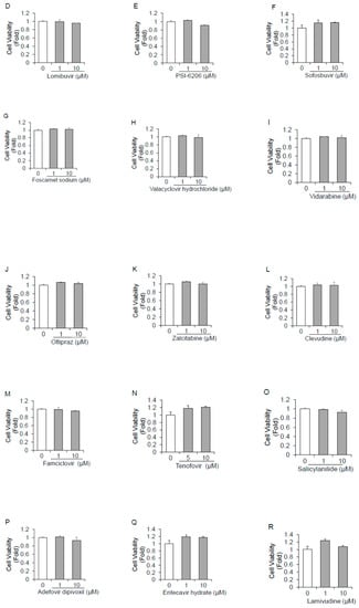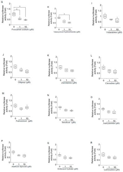 2.1. Favipiravir, Ribavirin, and Foscarnet Sodium Significantly Downregulate Hepatitis A Virus Subgenomic Replicon Replication in HuhT7 Cells