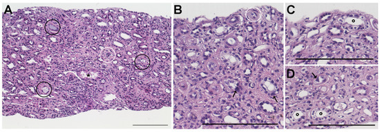 Chemotherapy-induced nephrotoxicity. (A) Hematoxylin and Eosin staining shows tubular damage in a kidney biopsy of a patient following treatment with a cocktail of cisplatin, carboplatin, etoposide, cyclophosphamide, and vincristine. (B–D) Higher magnification of biopsy shown in (A). Black circles indicate distal tubular casts. White circles indicate luminal cellular debris. * indicates proximal tubule injury. ° indicates regenerative nuclear atypia. Arrows indicate karyomegaly. Bars 100 µm.