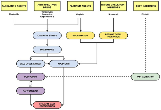Targeted agents. Molecular-targeted agents are compounds that target specific molecules involved in the growth and spread of cancer cells [111]. In respect to cytotoxic agents, targeted agents are thought to have fewer side effects and cause less harm to non-cancer cells. Epidermal growth factor receptor inhibitors (EGFR inhibitors) are used extensively to treat various cancers, such as non-small-cell lung cancer, breast, head and neck, and pancreatic cancer [112]. Epidermal growth factor receptor (EGFR) is a transmembrane protein with intrinsic tyrosine kinase activity that can be activated by several ligands, modulating cell differentiation, proliferation, and survival through the EGFR–ERK and EGFR–PI3K–Akt signaling pathways [113,114]. The blockade of EGFR may result in AKI, nephrotic syndrome, and proliferative glomerulonephritis [115,116]. The exact pathogenesis of EGFR inhibitors-associated kidney-related disorders is unclear [112]. However, it should be noted that EGFR is widely expressed in mammalian kidneys [117]. In this respect, functional analysis performed in vivo showed that treatment with an EGFR tyrosine kinase inhibitor (erlotinib, a commonly used anti-cancer agent [118]) delayed renal function recovery after AKI [114]. In contrast, EGFR activation accelerated kidney repair [114]. Indeed, proximal tubular EGFR knock-out (KO) mice showed persistent tubular cell damage in the weeks after AKI compared to wild-type mice [114]. Interestingly, no difference was detected in innate immune system activation and inflammatory cell infiltration [114]. This implies that the delayed recovery rate of EGFR-KO mice is related to a direct effect on TEC rather than a systemic effect. Recently, activation of the EGFR-PI3K-Akt pathway in response to AKI was shown to activate Yes-associated protein (YAP1), promoting kidney repair [119]. YAP1 is the main effector of the highly conserved Hippo pathway [120]. Unlike other signaling pathways, the Hippo pathway does not have dedicated receptors, but it is rather regulated by a network of upstream components [120]. This pathway appears to work as a sensor for tissue integrity, responding and adapting accordingly [120]. Importantly, YAP1 has been reported to control polyploidization in the liver through Akt signaling [121]. In the liver, YAP1 activation turns on Akt signaling, promoting S-Phase Kinase Associated Protein 2 (SPK2) acetylation, resulting in cytoplasmic retention, leading to cell polyploidy [121]. Interestingly, loss of liver kinase B1 (LKB1) in mouse hepatocytes enhances EGFR activation, which leads, in turn, to mitotic slippage and increased cell polyploidization [122]. Collectively, the importance of polyploidization [54,123] and EGFR downstream activation of YAP1 in response to AKI [114] may indicate that blocks of EGFR could profoundly affect the endogenous repair potential of the kidney, especially when administered in combination with cytotoxic agents that are notoriously nephrotoxic, exacerbating their damage.