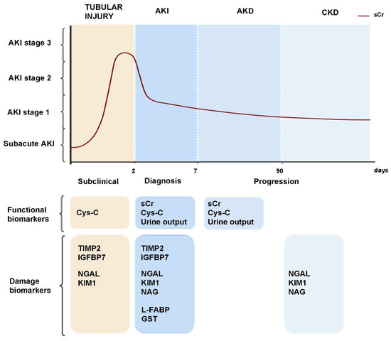 Biomarkers’ detection in AKI, AKD, and CKD. Among the currently used biomarkers, only a few of them are detected early during AKI progression, before a rise in the serum creatinine (sCr) is present. These markers indicate early tubular injury or subclinical acute kidney injury (AKI). AKI itself is recognized by both functional and damage biomarkers, whereas the stages of AKI are defined by the extent of kidney function impairment represented by sCr rise. AKI accompanied by prolonged tubular damage is defined as acute kidney disease (AKD). When the injury is extended and irreversible, and kidney function cannot be restored, it leads to chronic kidney disease (CKD). Abbreviations: Cys-C, cystatin C; IGFBP-7; insulin-like growth factor-binding protein 7; TIMP-2; metalloproteinase inhibitor 2; GST: Glutathione S-transferase; NAG: N-Acetyl-Beta-D-Glucosaminidase; NGAL: Neutrophil Gelatinase-Associated Lipocalin; KIM-1: Kidney Injury Molecule-1; L-FABP: Liver-type Fatty Acid-Binding Protein.