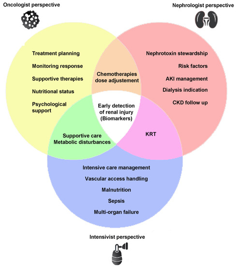 The ideal management of cancer patients with nephrotoxic-AKI. Venn diagram representing the aspects to be considered when treating patients for early acute kidney injury (AKI) recognition and effective oncologic patient management. Abbreviations: KRT: Kidney Replacement Therapy; CKD: Chronic Kidney Disease.