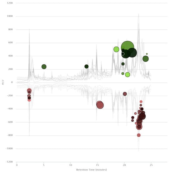 Differential feature cloud plot of MCF-7 cells versus cells treated with VPA. The graphic shows the chromatographic distribution of upregulated (green) and downregulated (red) features, in which darker colors indicate lower p-values and wider circles indicate a higher value of log fold change (p-value ≤ 0.01 and fold change ≥ 1.5).