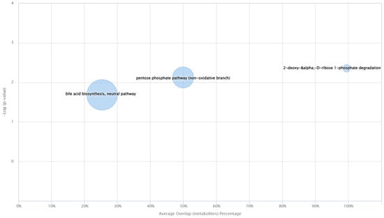 The most dysregulated pathway was 2′-deoxy-α-D-ribose 1-phosphate degradation, with both metabolites identified to be downregulated. It is worth mentioning that D-glyceraldehyde 3-phosphate is a metabolite shared between this and PPP, so its effect might be more related to this last pathway. Alterations in PPP, pyrimidine, purine, and primary bile acids metabolism were also found by Zhou et al. (2019) using a quadrupole-orbitrap instrument in MCF-7 cells, so this is a consistent effect exerted by VPA in this cell line. Besides alterations in energetic metabolism, these authors also found alterations in amino acid metabolism in this cell line and MDA-MB-231, both from breast cancer [].