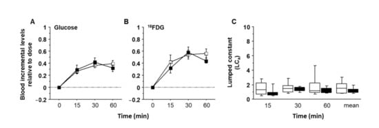 - Peltoniemi, P.; Lönnroth, P.; Laine, H.; Oikonen, V.; Tolvanen, T.; Grönroos, T.; Strindberg, L.; Knuuti, J.; Nuutila, P. Lumped constant for [(18)F]fluorodeoxyglucose in skeletal muscles of obese and nonobese humans. Am. J. Physiol. Endocrinol. Metab. 2000, 279, E1122–E1130. [Google Scholar] [CrossRef] [PubMed]