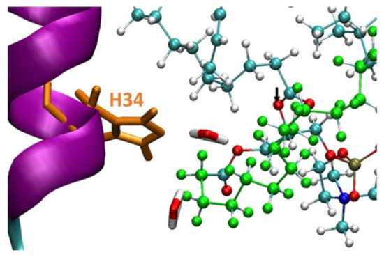 The His34 residue within the PLA2 at the close proximity to the active oxygen atom (seen in black arrow) in the PL-C12-cyclosporine prodrug. The hydrophobic chain of PL-prodrugs is colored in green. Two water molecules in close proximity to the His34 can also be observed. The illustration of the structures were performed by the vmd program [40].