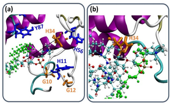 The distance between Cα of His34 and the active oxygen atom in (a) PL-C6-cyclosporine-PLA2 complex and (b) PL-C12-cyclosporine-PLA2 complex, showed that His34 is more in close proximity to the active oxygen in presence of PL-C12-cyclosporine than in presence of PL-C6-cyclosporine (Figure 5). The illustration of the structures were performed by the vmd program [40].