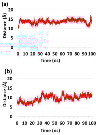 The MD simulations of the solvated constructed models were performed in the NPT ensemble using NAMD package [45] with the CHARMM27 forcefield with the CMAP correlation [46]. The energies of the complex prodrug-enzyme were minimized, and the model was explicitly solvated in a TIP3P water box [47,48]. Each water molecule within 2.5 Å of the models was removed. Counter ions were added at random locations to neutralize the models’ charge. The Langevin piston method [44,45,49] with a decay period of 100 fs and a damping time of 50 fs was used to maintain a constant pressure of 1 atm. The temperature 330 K was controlled by a Langevin thermostat with a damping coefficient of 10 ps [45]. The short-range van der Waals (VDW) interactions were calculated using the switching function, with a twin range cutoff of 10.0 and 12.0 Å. Long-range electrostatic interactions were calculated using the particle mesh Ewald method with a cutoff of 12.0 Å [50,51]. The equations of motion were integrated using the leapfrog integrator with a step of 1 fs. The counter ions and water molecules were allowed to move. The hydrogen atoms were constrained to the equilibrium bond using the SHAKE algorithm [52]. The minimized solvated systems were energy minimized for 5000 additional conjugate gradient steps and 20,000 heating steps at 250 K, with all atoms allowed to move. Then, the system was heated from 250 K to 300 K and then to 330 K for 300 ps and equilibrated at 330 K for 300 ps. The choice of the higher temperature than physiological temperature is to investigate the stability of the constructed models. Obviously, structures that are stable at higher temperature will be also stable at physiological temperature. Simulations ran for 100 ns for each variant model. To justify the timescale of the simulations, we computed the root-mean-square-deviation (RMSD) values along the MD simulations (Figure S3). The RAMS analysis demonstrated that after ~30 ns of the simulations, both variant models were converged. The structures were saved every 10 ps for analyses.
