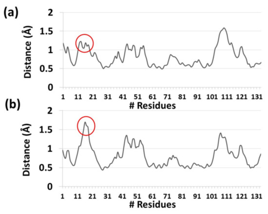 The root-mean-square fluctuations (RMSF) of each residue within PLA2 for the prodrugs (a) PL-C6-cyclosporine and (b) PL-C12-cyclosporine.