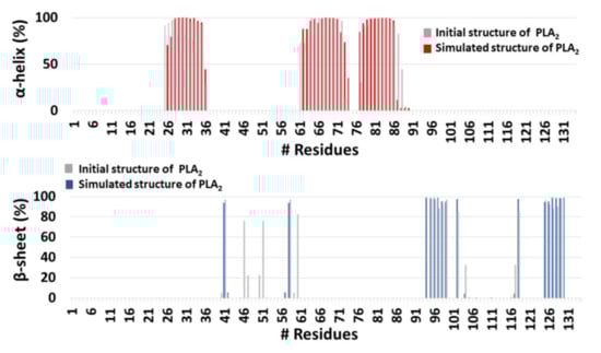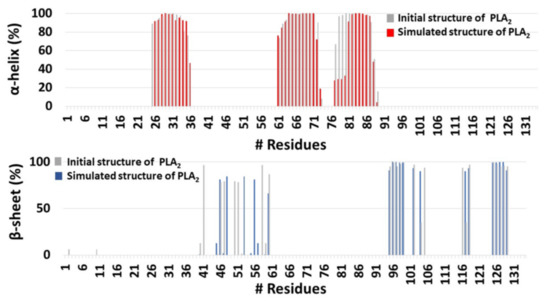 The helical and the β-sheet structures of PLA2 in the initial and simulated PL-C12-cyclosporine-PLA2 complex, using the database of secondary structure of protein (DSSP) method.