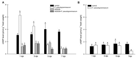 Determination of intracellular cyclic nucleotides levels in B. distachyon plants infected with F. pseudograminearum. (A) Time course of cGMP generation in B. distachyon in response to F. pseudograminearum infection and inhibitor (NS 2028) treatment; (B) time course of cAMP generation in B. distachyon in response to F. pseudograminearum infection. Control plants were not infected or treated with the inhibitor. The data are shown as mean values (n = 3), and error bars represent the standard error of the mean. Different letters above the bars indicate significant differences at p < 0.05 (ANOVA followed by Tukey’s test).