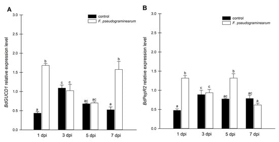 Expression analysis of guanylyl cyclase genes in F. pseudograminearum-infected B. distachyon plants. (A) mRNA levels of BdGUCD1 in B. distachyon in response to F. pseudograminearum infection; (B) mRNA levels of BdPepR2 in B. distachyon in response to F. pseudograminearum infection. Control plants were not infected or treated with the inhibitor. Different letters above the bars indicate significant differences at p < 0.05 (ANOVA followed by Tukey’s test).