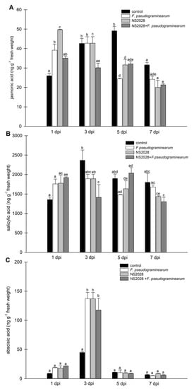 Determination of endogenous levels of phytohormones in B. distachyon infected with F. pseudograminearum. (A) Jasmonic acid; (B) salicylic acid; and (C) abscisic acid. Control plants were not infected or treated with the inhibitor. Data are shown as mean values (n = 3), and error bars indicate the standard error of the mean. Different letters above the bars indicate significant differences at p < 0.05 (ANOVA followed by Tukey’s test).