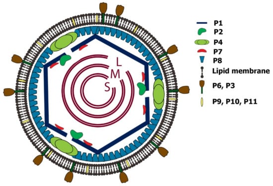 - Poranen, M.M.; Mäntynen, S.; Ictv Report, C. ICTV Virus Taxonomy Profile: Cystoviridae. J. Gen. Virol. 2017, 98, 2423–2424. [Google Scholar] [CrossRef]