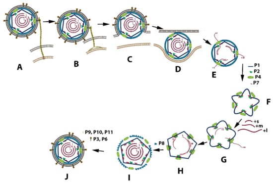 - Butcher, S.J.; Dokland, T.; Ojala, P.M.; Bamford, D.H.; Fuller, S.D. Intermediates in the assembly pathway of the double-stranded RNA virus phi6. EMBO J. 1997, 16, 4477–4487. [Google Scholar] [CrossRef]