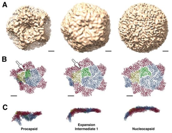 - Nemecek, D.; Cheng, N.; Qiao, J.; Mindich, L.; Steven, A.C.; Heymann, J.B. Stepwise expansion of the bacteriophage ϕ6 procapsid: Possible packaging intermediates. J. Mol. Biol. 2011, 414, 260–271. [Google Scholar] [CrossRef][Green Version]
