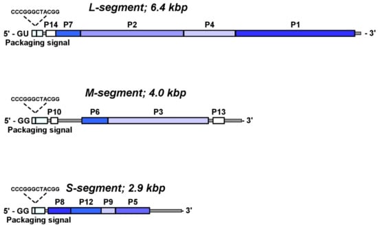 - Borodavka, A.; Desselberger, U.; Patton, J.T. Genome packaging in multi-segmented dsRNA viruses: Distinct mechanisms with similar outcomes. Curr. Opin. Virol. 2018, 33, 106–112. [Google Scholar] [CrossRef]