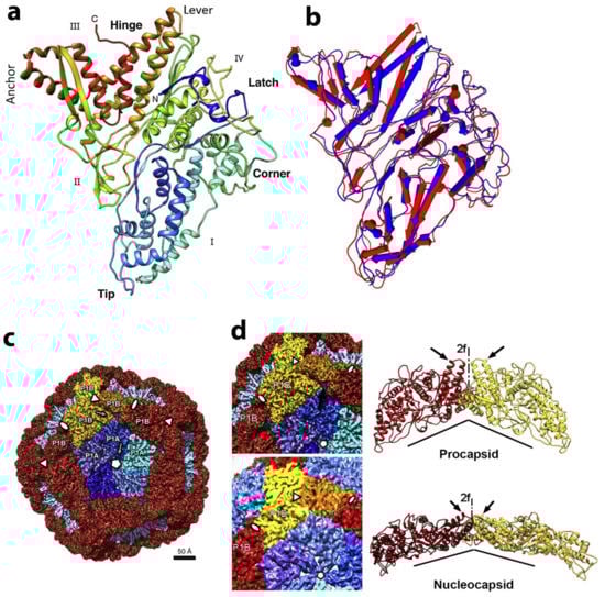 - Nemecek, D.; Boura, E.; Wu, W.; Cheng, N.; Plevka, P.; Qiao, J.; Mindich, L.; Heymann, J.B.; Hurley, J.H.; Steven, A.C. Subunit folds and maturation pathway of a dsRNA virus capsid. Structure 2013, 21, 1374–1383. [Google Scholar] [CrossRef]