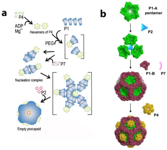- Poranen, M.M.; Paatero, A.O.; Tuma, R.; Bamford, D.H. Self-assembly of a viral molecular machine from purified protein and RNA constituents. Mol. Cell 2001, 7, 845–854. [Google Scholar] [CrossRef]