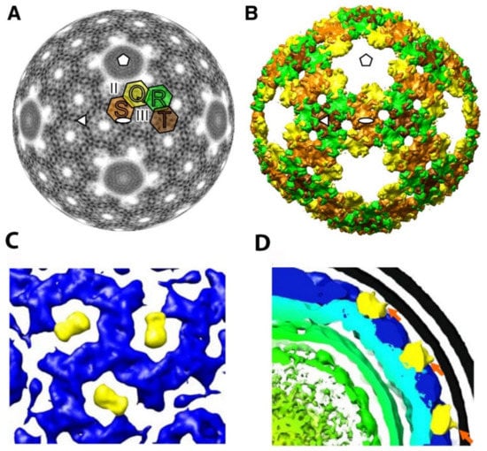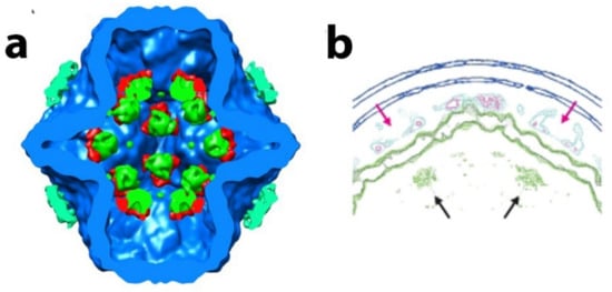 - Wei, H.; Cheng, R.H.; Berriman, J.; Rice, W.J.; Stokes, D.L.; Katz, A.; Morgan, D.G.; Gottlieb, P. Three-dimensional structure of the enveloped bacteriophage phi12: An incomplete T = 13 lattice is superposed on an enclosed T = 1 shell. PLoS ONE 2009, 4, e6850. [Google Scholar] [CrossRef]