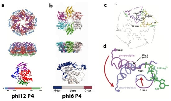 - Mancini, E.J.; Kainov, D.E.; Grimes, J.M.; Tuma, R.; Bamford, D.H.; Stuart, D.I. Atomic snapshots of an RNA packaging motor reveal conformational changes linking ATP hydrolysis to RNA translocation. Cell 2004, 118, 743–755. [Google Scholar] [CrossRef] [PubMed]