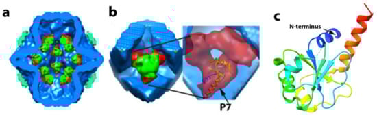 - Nemecek, D.; Qiao, J.; Mindich, L.; Steven, A.C.; Heymann, J.B. Packaging accessory protein P7 and polymerase P2 have mutually occluding binding sites inside the bacteriophage 6 procapsid. J. Virol. 2012, 86, 11616–11624. [Google Scholar] [CrossRef]
