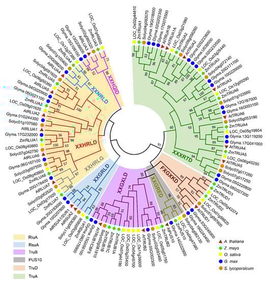 To identify the PUS genes in Arabidopsis and maize, we used the hidden Markov model (HMM) based search against proteome sequences of Arabidopsis and maize via HMMER (https://hmmer.org/ (11 February 2022)) taking an e-value cutoff of 1 × 10−5. The amino acid sequences were further confirmed in NCBI (https://www.ncbi.nlm.nih.gov (11 February 2022)), Ensembl plants (https://plants.ensembl.org/index.html (11 February 2022)) and maizeGDB (https://www.maizegdb.org/ (11 February 2022)). After redundant sequences and sequences without core catalytic domain were removed, a total of 20 genes in Arabidopsis and 22 genes in maize were identified and used for further analysis, respectively (Tables S1 and S2). Additionally, 22, 31, and 19 PUS genes in Oryza sativa, Glycine max, and Solanum lycopersicum, respectively, were identified using the same strategy from phytozome (https://phytozome.jgi.doe.gov/pz/portal.html (11 February 2022)) in this study (Table S3). To analyze the evolutionary relationships of the AtPUS and ZmPUS proteins, an unrooted phylogenetic tree of plant PUS genes was constructed based on the sequences of PUS catalytic domains from A. thaliana, Glycine max, Zea mays, Oryza sativa, and Solanum lycopersicum (Figure 1 and Table S4). Combined with the typical features of the conserved catalytic motif in enzymatic domain, the phylogenetic analysis showed that the PUS proteins were clustered into two groups: the first group share homological conserved catalytic domain with bacteria rRNA pseudouridine synthase, which could be further divided into two subfamilies, RluA and RsuA; the second group share homological conserved catalytic domain with bacteria tRNA pseudouridine synthase, which could be further divided into four subfamilies, TruA, TruB, TruD, and Pus10. Notably, there are only one copy of Pus10 gene in all the plant species we checked, which is consistent with the observation in animals and archaea [], suggesting that Pus10 might play an essential role in a strict dosage-dependent manner. The RsuA subfamily is the largest PUS subfamily in E. coli, while it contracted to have only one or two members in each plant species we checked. Instead, either RluA or TruA is the largest family in Arabidopsis, maize, rice, soybean, and tomato. Therefore, all maize and Arabidopsis PUS genes were designated based their subfamily name, respectively (Figure 1. Tables S1 and S2).