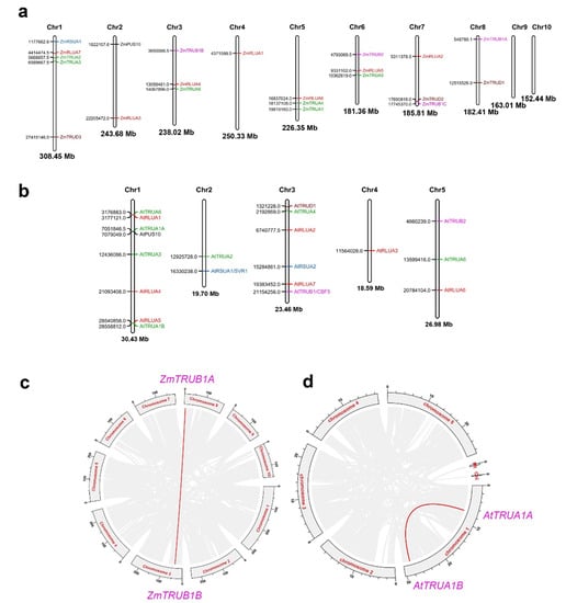 According to the chromosomal location information of AtPUS and ZmPUS genes from the GFF3 reference file of Arabidopsis and maize genomes, their chromosomal maps were constructed using Mapchart, a local analytical tool (https://www.wur.nl/en/show/Mapchart.htm (13 February 2022)) (Figure 2a,b) []. ZmPUSs are distributed on most of chromosomes, with the exception of chromosome 9 and 10. At most, five genes including ZmRSUA1, ZmRLUA7, ZmTRUA2, ZmTRUA3, and ZmTRUD3 are located on chromosome 1. In contrast, AtPUSs are distributed on all five chromosomes in the compact genome of Arabidopsis, and chromosome 1 have the highest density of PUS genes, with 8 members. Gene synteny analysis revealed only one segmental duplication event involving two TruB genes, ZmTRUB1A and ZmTRUB1B, whereas there is no identified tandem duplication of PUS genes in maize genome (Figure 2c). Similarly, only one segmental duplication event involving two TruA genes, AtTRUA1A and AtTRUA1B, was identified on the chromosome 1 in Arabidopsis (Figure 2d). There is no whole genome duplication or segmental duplication event identified in colinear relationship analysis of PUS genes between maize and Arabidopsis (Figure S1). Instead, two colinear gene pairs were identified between Arabidopsis and rice, while 3, 2, 7 colinear PUS gene pairs were identified between Arabidopsis and tomato, Arabidopsis and soybean, rice and maize, respectively (Figure S1 and Table S5).