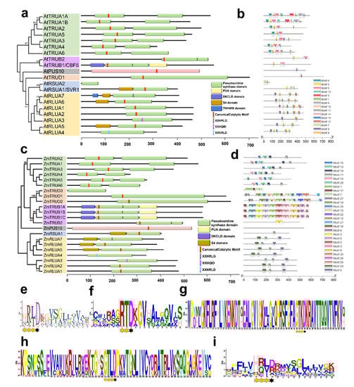 Conserved domains and motifs of AtPUS and ZmPUS proteins. (a) Conserved domains of AtPUS proteins. (b) Conserved motifs of AtPUS proteins. (c) Conserved domains of ZmPUS proteins. (d) Conserved motifs of ZmPUS proteins. (e) Frequency distribution of amino acids in the motif 2 of AtPUS proteins. (f) Frequency distribution of amino acids in the motif 15 of ZmPUS proteins from TruA subfamily. (g) Frequency distribution of amino acids in the motif 10 of ZmPUS proteins from TruD subfamily. (h) Frequency distribution of amino acids in the motif 2 of ZmPUS proteins from TruB subfamily. (i) Frequency distribution of amino acids in the motif 11 of ZmPUS proteins from RluA and RsuA subfamilies. The conserved active Asp was indicated by closed asterisk; the other conserved amino acids were indicated by open asterisk.
