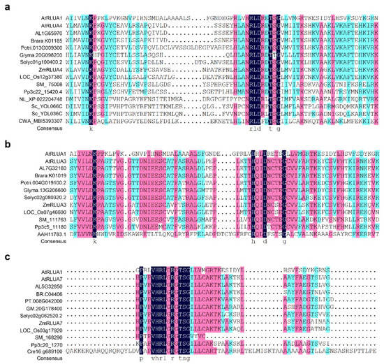 Notably, not all the members of RluA subfamily have the canonical six-amino-acid motif of XXHRLD, and there are three types of six-amino-acid motif variants including XXNRLD, XXHQID, and XXHRLG, in the members of both Arabidopsis and maize RluA subfamily (Figure 1 and Figure 5). Both the XXNRLD- and XXHQID-type catalytic motif variants are widely found in the RluA proteins from the close cruciferous species such as Arabidopsis lyrata and Brassca rapa, dicot and monocot plants, and even some lower-order plants such as Selaginella moellendorffii and Physcomitrella patens, whereas they are not found in algae such as Chara braunii and Chlamydomonas reinhardtii (Figure 5a,b). The universally conserved catalytic Asp is replaced with glycine in the XXHRLG-type RluA variants, such as AtRLUA7 and ZmRLUA7, probably leading to the loss of pseudouridylation activity. However, it is surprising that this putative pseudouridylation-defective RluA variants are present in alga, fern, moss, and spermatophyte (Figure 5c).