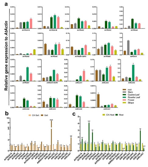 To analyze the expression pattern of AtPUS genes in different tissues, including root, stem, cauline leaf, rosette leaf, flower, and silique, quantitative real-time PCR (qRT-PCR) were further performed. The results showed that all the AtPUS genes except AtRSUA2 could be detected by qRT-PCR analysis (Figure 7a). The expression levels of most of AtPUS genes were relatively high in both cauline leaf and rosette leaf, in comparison with the ones in other tissues. AtTRUA1A, AtTRUB1, and AtRLUA1 were highly expressed in flower, while AtTRUA5 and AtRLUA7 has the highest expression in silique and root, respectively. In yeast and mammals, dynamic pseudouridylation and PUS subcellular localization upon various stress indicated the regulatory role of PUSs in response to stresses [,,]. Here we further investigated the expression pattern of Arabidopsis seedlings under high salt stress and heat stress. AtPUSs had diverse responses to different stresses. Under salt stress, AtTRUA6, AtTRUB1/CBF5, AtPUS10, AtRLUA1, AtRLUA3, and AtRLUA7 were highly induced, whereas AtTRUA1B, AtTRUA4, AtTRUB2, AtTRUD1, and AtRLUA2 were significantly down-regulated (Figure 7b). Upon heat stress, three members of AtTRUA subfamily, AtTRUA1A, AtTRUA2, AtTRUA3, and AtRLUA6 were significantly up-regulated, and in contrast, AtTRUB2, AtRLUA1, and AtRLUA7 were significantly down-regulated (Figure 7c).