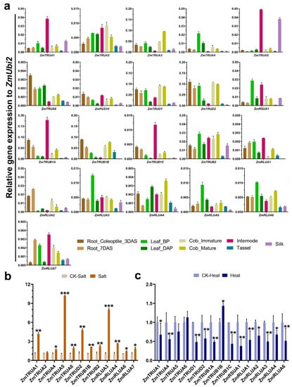 Likewise, to further analyze the expression pattern of ZmPUS genes, the expression pattern of maize tissues/organs (coleoptile, root, internode, leaf, tassel, cob, silk) at different developmental stages and maize seedlings with salt and heat stress treatments were also investigated by qRT-PCR analysis (Figure 8). In line with the observation in the expression of AtPUSs, there’s no consistent expression pattern even in each of ZmPUS subfamilies. The expression levels of most of ZmPUS genes were relatively high in leaf, internode, and cob. In particular, ZmTRUA3, ZmTRUD1, and ZmRLUA4 have the highest expression level in cob, whereas ZmTRUA5 largely expressed in internode and silk (Figure 8a). Under salt stress, ZmTRUA1, ZmTRUA5, ZmTRUA6, ZmTRUD2, ZmTRUB1B, ZmTRUB2, ZmRLUA3, and ZmRLUA4 were highly induced (Figure 8b). Under heat stress, several ZmPUS genes such as ZmTRUB1A/C and ZmRSUA1 were down-regulated, while ZmTRUB1B were moderately up-regulated (Figure 8c).
