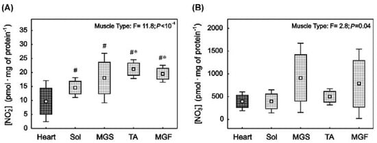 By choosing varied types of muscles for the purpose of this study, such as heart ventricles, as well as the slow-twitch soleus and the fast-twitch skeletal muscles (MGS, MGF, TA), we aimed to collect muscle tissues with different contents of mitochondria and varied capacities of oxidative energy production (see e.g., [,]) to relate the level of muscle NO• metabolites i.e., [NO2−] and [NO3−] to the muscle oxidative potential. In the group of striated muscles heart possess the highest mitochondrial volume i.e., it accounts for~28% of rat cardiomyocytes volume []. In rat skeletal muscles the highest content of mitochondria are found in the fast-twitch oxidative type IIA muscle fibres, then in the slow-twitch oxidative type I muscle fibres and in the fast-twitch oxidative glycolytic type IIX muscle fibres. The lowest content of mitochondria are found in fast-twitch glycolytic IIB muscle fibres (for review see []).
