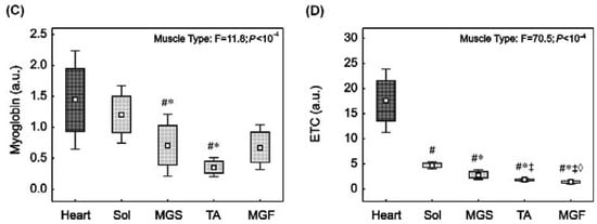 The level of the oxygen buffering protein myoglobin in the heart was similar to that in Sol (p > 0.05), however, it was significantly higher than in MGS (~1.8-fold, p = 0.007) and TA (~4.5-fold, p = 0.0001) (Figure 1C). Moreover, a clear tendency towards a higher myoglobin content in the heart compared to MGF was observed (p = 0.053). Furthermore, myoglobin content in the slow-twitch Sol was significantly higher than in fast oxidative MGS (~1.5-fold, p = 0.02) and fast glycolytic TA (~3.8-fold, p = 0.0004). The difference between the Sol and MGF was not statistically significant (~2-fold, p = 0.14). Additionally, no significant differences (p > 0.05) in myoglobin content between MGS and TA, MGS and MGF, or MGF and TA were found (Figure 1C).