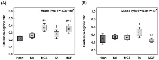 Nitric oxide synthase activity (reflected by citrulline-to-arginine ratio) and arginase activity (reflected by ornithine-to-arginine ratio) in rat striated muscles with varied muscle fibre type composition. Citrulline-to-arginine ratio (A) and ornithine-to-arginine ratio (B) in the heart (dark square) and in the locomotory muscles (bright squares) i.e., soleus (Sol), slow part of medial gastrocnemius (MGS), tibialis anterior (TA) and fast part of medial gastrocnemius (MGF). Boxes and whiskers represent, correspondingly, the 95% confidence intervals for means and the standard deviations in samples of 12 animals for each studied muscle tissue (i.e., heart, Sol, MGS, TA and MGF). The impact of muscle type on the analysed variables is presented. Results of one-way ANOVA and Tukey post-hoc are shown in (A), whereas Welch ANOVA and post-hoc Games–Howell results are shown in (B). # denotes significant difference to the heart; * denotes significant difference to the Sol; ‡ denotes significant difference to MGS; ◊ denotes significant difference to TA.