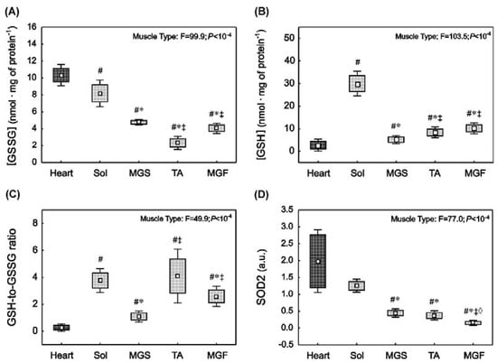 Oxidative stress and antioxidant capacity markers in rat striated muscles with varied muscle fibre type composition. Oxidised glutathione concentration ([GSSG], (A)), glutathione concentration ([GSH], (B)), total antioxidant capacity ([GSH-to-GSSG], (C)) and superoxide dismutase type 2 content (SOD2 content (D) in the heart (dark square) and in the locomotory muscles (bright squares) i.e., soleus (Sol), slow part of gastrocnemius (MGS), tibialis anterior (TA) and fast part of gastrocnemius (MGF). Boxes and whiskers represent, correspondingly, the 95% confidence intervals for means and the standard deviations in samples of 12 animals for each studied muscle tissue (i.e., heart, Sol, MGS, TA and MGF). The impact of muscle type on the analysed variables is presented. Results of one-way ANOVA and Tukey post-hoc are shown in (D), whereas Welch ANOVA and post-hoc Games–Howell results are presented in (A–C). # denotes significant difference to the heart; * denotes significant difference to the Sol; ‡ denotes significant difference to MGS; ◊ denotes significant difference to TA.