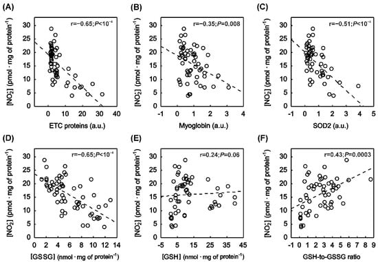 Furthermore, a significantly negative correlation between muscle nitrate [NO3−] and myoglobin content (r = −0.29, p = 0.03) was found, whereas no significant correlation (p > 0.05) was noticed between [NO3−] and ETC proteins content, or between [NO3−] and SOD2 content (not shown).