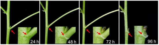 Effect of thidiazuron (TDZ) on cotton leaf abscission at 24, 48, 72, and 96 h after treatment; 750 mg/L TDZ was applied evenly to the whole plants at the six-leaf stage. The pictures were taken at 24, 48, 72, and 96 h, respectively, after treatment.