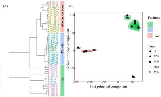 Transcriptome relationship among five time points of thidiazuron (TDZ) treatment in leaf (L), petiole (P), and abscission zone (AZ). (A) Cluster dendrogram showing three distinct tissues of leaf, petiole, and AZ. (B) Principal component analysis (PCA) of five time point samples in leaf, petiole, and AZ. Cotton leaves were treated with 750 mg/L thidiazuron (TDZ). Leaf, petiole, and AZ were sampled at 0, 12, 24, 48, and 72 h after treatment and were subjected to RNA-seq analyses.