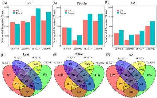 Differentially expressed genes (DEGs) regulated by TDZ. The total number of up- and down-regulated DEGs in leaf (A), petiole (B), and AZ (C) upon TDZ treatment. Venn diagram displaying DEGs and common genes in leaf (D), petiole (E), and AZ (F) upon TDZ treatment at four time points. DEGs were determined between 12 h and 0 h, 24 h and 0 h, 48 h and 0 h, 72 h and 0 h, respectively. The DEGs were controlled by FDR < 5% and |log2Fc| ≥ 1.
