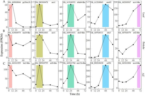 To verify the DEGs’ response to TDZ treatment, several genes involved in the plant hormone pathway were selected to detect their expressing change by using FPKM in leaf (Figure 4A), petiole (Figure 4B), and AZ (Figure 4C) at indicated time points after TDZ treatment. Auxin transport gene GhLAX2 (Gh_A01G1955), gibberellin biosynthesis gene GhGA20ox1 (Gh_A09G0044), and auxin signaling gene GhIAA26 (Gh_A10G0575) [,], were highly expressed before TDZ treatment in all the tissues. Auxin signaling gene GhARF4 (Gh_D05G0755) and ethylene biosynthesis genes GhACO1 (Gh_D02G0478) and GhACO2 (Gh_D05G1663) [], were highly expressed at 12 h after TDZ treatment in all the tissues. Auxin signaling gene GhAUX15a (Gh_A03G1766), abscisic acid metabolism gene GhABAH4 (Gh_A13G0351), and cytokinin metabolism gene GhCKX5 (Gh_A05G1631) [], were highly expressed at 24 h after TDZ treatment in all the tissues. Ethylene signaling gene GhERF1b (Gh_D02G0430), auxin signaling gene GhAUX85 (Gh_A12G0043), and cytokinin metabolism gene GhCKX3 (Gh_A07G0111), were highly expressed at 48 h after TDZ treatment in all the tissues. Ethylene biosynthesis genes GhACO4 (Gh_A03G1004) and GhACO3 (Gh_A02G0367), and ethylene signaling gene GhERF2 (Gh_A07G0379), were highly expressed at 72 h after TDZ treatment in all the tissues. Most of the gene expressing patterns selected here were consistent with previous reports [,]. To further validate the quality of the gene expression profiles, a total of 6 transcripts were randomly selected in AZ to compare the FPKM values and RT-qPCR data. The results showed that both of them largely corresponded to each other (cor > 0.58, average cor = 0.72) (Figure S2).