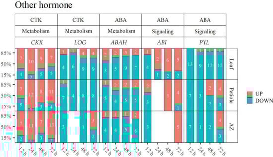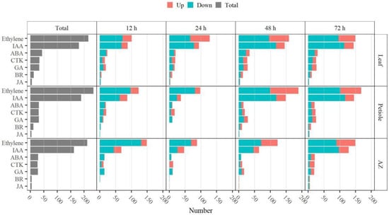 TDZ regulates the expression of phytohormone-related genes. The total number of up- and down-regulated DEGs related to plant hormones in leaf, petiole, and AZ at indicated time points after TDZ treatment were shown. DEGs were determined between 12 h and 0 h, 24 h and 0 h, 48 h and 0 h, 72 h and 0 h, respectively. The DEGs were controlled by FDR < 5% and |log2Fc| ≥ 1.