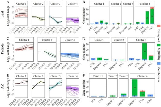 The dynamic expression and gene numbers of DEGs related to phytohormone in leaf, petiole, and AZ upon TDZ treatment. K-means clustering and gene numbers at four time points upon TDZ treatment in leaf (A,B), petiole (C,D), and AZ (E,F), respectively. DEGs were determined between 12 h and 0 h, 24 h and 0 h, 48 h and 0 h, 72 h and 0 h, respectively. The DEGs were controlled by FDR < 5% and |log2Fc| ≥ 1 at all four time points.