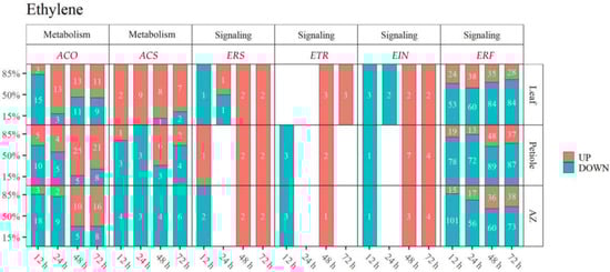 Phytohormones play a key role in the plant life cycle and are closely related to the organ abscission process []. In this study, we found 516, 522, and 459 DEGs were involved in hormone metabolism and signaling in leaf, petiole, and AZ upon TDZ treatment, respectively (Figure 5). Most of the DEGs were related to ethylene (216 DEGs in leaf, 235 DEGs in petiole, and 212 DEGs in AZ) and auxin (170 DEGs in leaf, 177 DEGs in petiole, and 153 DEGs in AZ). Meanwhile, a certain number of DEGs were related to ABA (44 DEGs in leaf, 32 DEGs in petiole, and 29 DEGs in AZ) and CTK (34 DEGs in leaf, 31 DEGs in petiole, and 27 DEGs in AZ); while others were related to GA (33 DEGs in leaf, 32 DEGs in petiole, and 28 DEGs in AZ), BR (13 DEGs in leaf, 11 DEGs in petiole, and 5 DEGs in AZ), and JA (6 DEGs in leaf, 4 DEGs in petiole, and 5 DEGs in AZ). Those DEGs were most enriched at 48 h in leaf, at 48–72 h in petiole, and at 72 h in AZ, suggesting that TDZ has earlier effects on phytohormone-related genes in leaf than that in petiole and AZ.