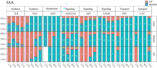 IAA-related DEGs were identified in leaf, petiole, and AZ, respectively (Figure 8, Supplementary Table S3). Auxin-responsive gene GH3s (indole-3-acetic acid-amido synthetase) that encode IAA-amide synthetase involved in the maintenance of hormonal homeostasis by conjugating free IAA to amino acids, were mainly down-regulated in leaf, petiole, and AZ. IAA-Leucine Resistant 1-like Hydrolase gene ILRs (ILR1-LIKE3, ILR1-LIKE4, ILR1-LIKE6, ILR3-LIKE), which encode IAA-amido hydrolase, were mainly up-regulated in petiole and AZ at indicated time points (31/35 = 88.6%). YUCCA gene YUCs (YUCCA6-LIKE, YUCCA8, YUCCA10), involving in catalyzing IAA biosynthesis, were mostly down-regulated from 12 h in leaf (10/11 = 90.9%), and from 72 h in petiole (2/3 = 66.7%) and AZ (3/4 = 75%). IAA signaling genes, AUX/IAAs (AUX6B-LIKE, AUX15A-LIKE, AUX22, AUX22D-LIKE, AUX28-LIKE, AUXx15-LIKE, IAA1, IAA1-LIKE, IAA2-LIKE, IAA4-LIKE, IAA8-LIKE, IAA9, IAA9-LIKE, IAA11-LIKE, IAA13-LIKE,, IAA14-LIKE, IAA16-LIKE, IAA26-LIKE, IAA27, IAA27-LIKE, IAA29, ARG2-LIKE, ARG7-LIKE, ABP1, ABP19A-LIKE, ABPt85, AIR12-LIKE) (447/540 = 82.8%) and SAURs (SAUR32, SAUR32-LIKE, SAUR36-LIKE, SAUR41-LIKE, SAUR62-LIKE, SAUR71-LIKE, SAUR72, SAUR72-LIKE) (139/167 = 83.2%), were mostly down-regulated; while most of the ARFs (ARF2-LIKE, ARF3-LIKE, ARF4-LIKE, ARF5, ARF5-LIKE, ARF6-LIKE, ARF8-LIKE, ARF9-LIKE, ARF10-LIKE, ARF17, ARF18, ARF18-LIKE, ARF19-LIKE, ARF23-LIKE, AFB-LIKE) were down-regulated in leaf (72/98 = 73.5%) and petiole (42/57 = 73.7%), and up-regulated in AZ (11/12 = 91.7%) at 12–48 h. Most of the PINs (PIN1-LIKE, PIN3, PIN3-LIKE, PIN5, PIN6, PIN8, PIN1B, PIN1C) (92/98 = 93.9%) and LAXs (LAX2, LAX3, LAX5) (57/65 = 87.7%), responsible for the transportation of IAA, were down-regulated in all the tissues at all the indicated time points. Together, we concluded that TDZ may reduce auxin biosynthesis first in leaf, then in AZ and petiole, and suppress IAA signal and transport in all the detected tissues.