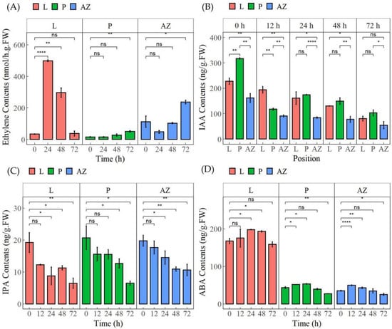 TDZ modulates the accumulation of ethylene (A), IAA (B), IPA (C), and ABA (D) in leaf, petiole, and AZ of cotton. Cotton leaves were treated with 750 mg/L TDZ. Leaf, petiole, and AZ were sampled at 0, 12, 24, 48, and 72 h after treatment and subjected to detect hormonal content. * p < 0.05, ** p < 0.01, **** p < 0.0001.
