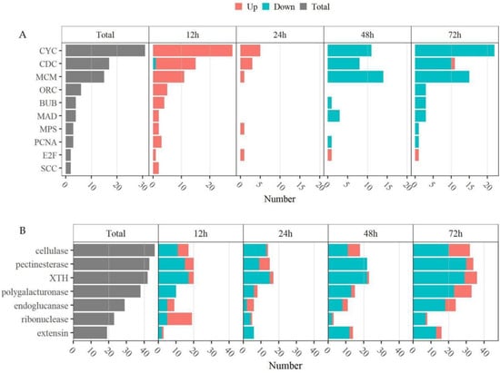 TDZ regulates the gene expression of the cell cycle (A) and cell wall (B) in AZ. DEGs were determined between 12 h and 0 h, 24 h and 0 h, 48 h and 0 h, 72 h and 0 h, respectively. The DEGs were controlled by FDR < 5% and |log2Fc| ≥ 1.