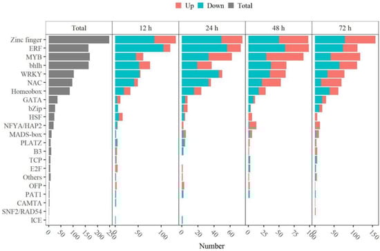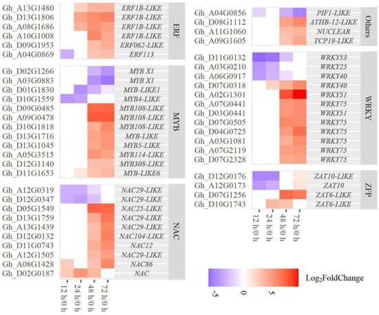 Transcription factors play an important role in regulating the expression of genes related to organ shedding [,,,]. In this study, 1197 differentially expressed transcription factors (TFs) were found in AZ after TDZ treatment, including Zinc finger, MYB, bhlh, ERF, WRKY, NAC, Homeobox, and so on (Figure 12, Supplementary Table S7). ERF, bhlh, and Homeobox TFs were mostly down-regulated at all four time points; while there were more WRKY, Zinc finger, MYB, and NAC TFs down-regulated at 12–24 h and more up-regulated genes at 48–72 h. The dynamic gene expression patterns of TFs were divided into four clusters including continuously up-regulated (Cluster 1), first up- and then down-regulated (Cluster 2), first down- and then up-regulated (Cluster 3), and continuously down-regulated (Cluster 4) (Figure S4A). More differentially expressed TFs were identified in Cluster 4 (Figure S4B). Among all the TFs, WRKY75, WRKY51, WRKY40, MYB108, MYB114, MYB308, MYB5, NAC12, NAC25, NAC29, NAC86, NAC104, ZAT6, ERF62, and ERF1B were up-regulated; while WRKY53, WRKY40, WRKY25, MYB4, NAC29, and ZAT10 were down-regulated in AZ (Figure 13).