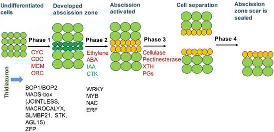 DEGs involved in the regulation of cotton leaf abscission at four abscission stages. In phase one, transcription factor genes of BOP1/BOP2 family, MADS family (JOINTLESS, MACROCALYX, SlMBP21, and STK), and zinc finger family were regulated by TDZ to promote the abscission differentiation. Meanwhile, CYC, CDC, MCM, and ORC were induced to promote the cell cycle. In phase two, TDZ promotes the biosynthesis gene expression and accumulation of ethylene and ABA, while suppressing the biosynthesis gene expression and accumulation of IAA and CTK. Meanwhile, TDZ regulates the gene expression of the transcription factors, including WRKY, MYB, NAC, and ERF regulate ethylene and IAA to promote the separation of AZ. In phase three, TDZ induces the gene expression related to cellulase, pectinesterase, XTH, and PGs to activate the degradation of the cell wall and intercellular substance for leaf shed off.