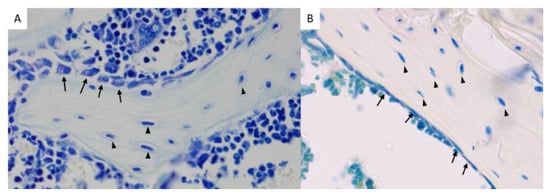 (A) Toluidine blue staining of a mouse femur showing osteoblasts (arrows) and osteocytes (triangles) (female, 8 weeks of age, original magnification 400×). (B) TRAP and toluidine blue staining of a mouse tibia, showing bone lining cells (arrows) and osteocytes (triangles) (female, 18 weeks of age, original magnification 400×).